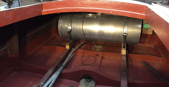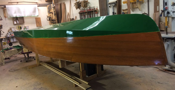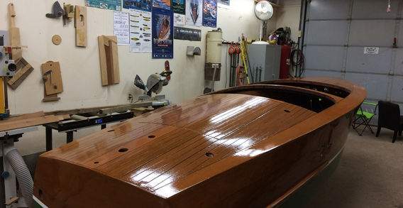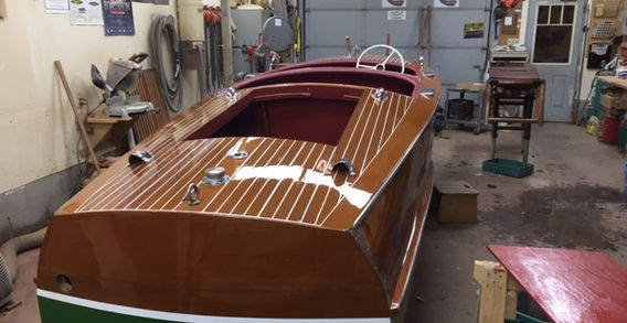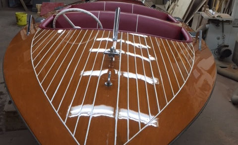 Once the boat was in the shop, we flipped the boat and applied a cold mold West System epoxy bottom. When the old bottom was removed, 2/3 of the frames needed replaced as well. Once flipped back, the side covering boards were sunk in slightly, so they were removed and refitted. New bottom paint, new varnish, and new upholstery completed this restoration.