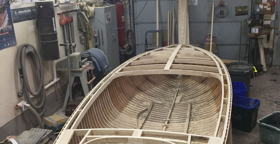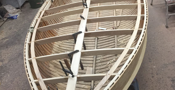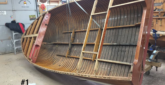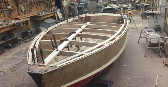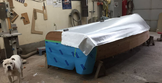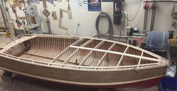 The old polyester fiberglass bottom was completely removed, and more than half of the ribs were replaced with new ones. A West System epoxy bottom was installed with two layers of cloth, then primed and painted in rich Epifanes red. Before varnishing the interior, the inside of the hull was fully encapsulated with S1 penetrating epoxy for added protection.